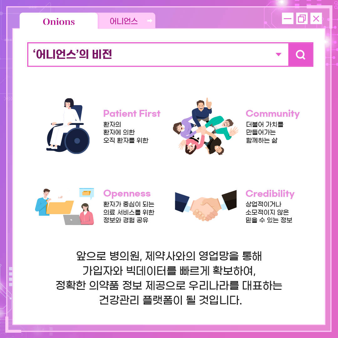 "환자를 위한", "더불어 사는 삶", "공유", 그리고 "신뢰"를 핵심 가치로 지향하는 '어니언스'!