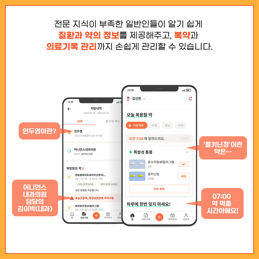 여러분이 원하시는 질환 정보, 처방 약 정보, 복약 관리 등의 서비스를 제공받으실 수 있답니다!