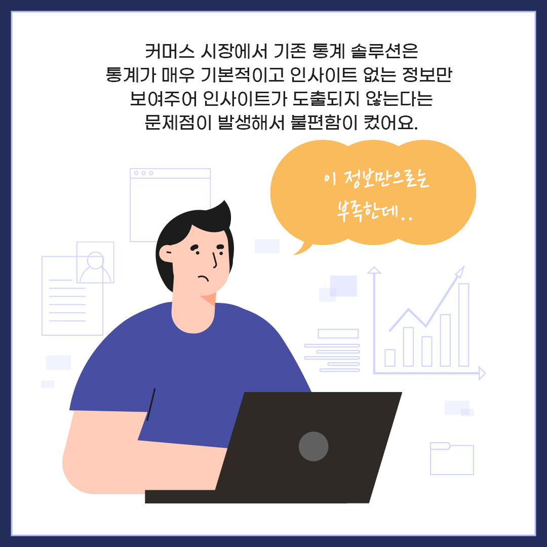 커머스 시장에서 기존 통계 솔루션은 통계가 매우 기본적이고 인사이트 없는 정보만 보여주어,