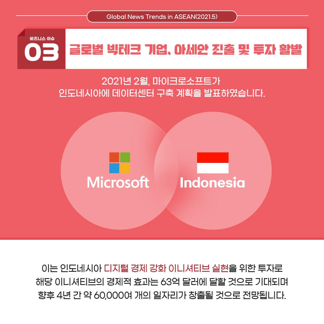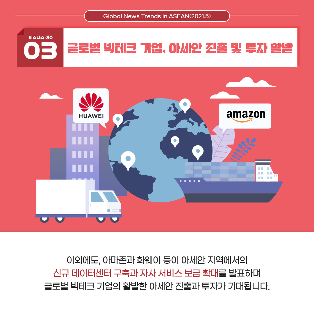세 번째 이슈는 '글로벌 빅테그 기업, 아세안 진출 및 투자 활발' 입니다.