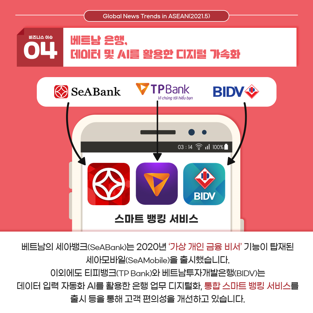 베트남의 세아뱅크(SeABank)는 2020년 '가상 개인 금융 비서' 기능이 탑재된 세아 모바일(SeAMobile)을 출시했습니다.