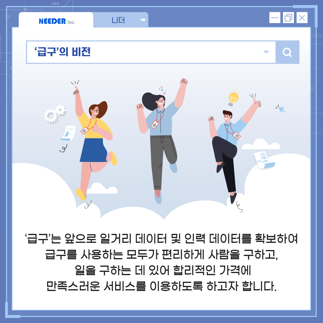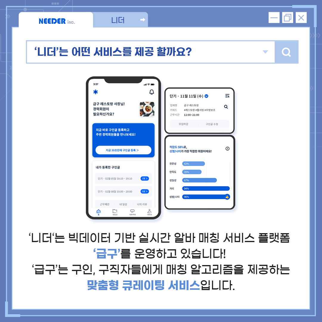 '니더'는 빅데이터 기반 실시간 알바 매칭 서비스 플랫폼 '급구'를 운영하고 있습니다!