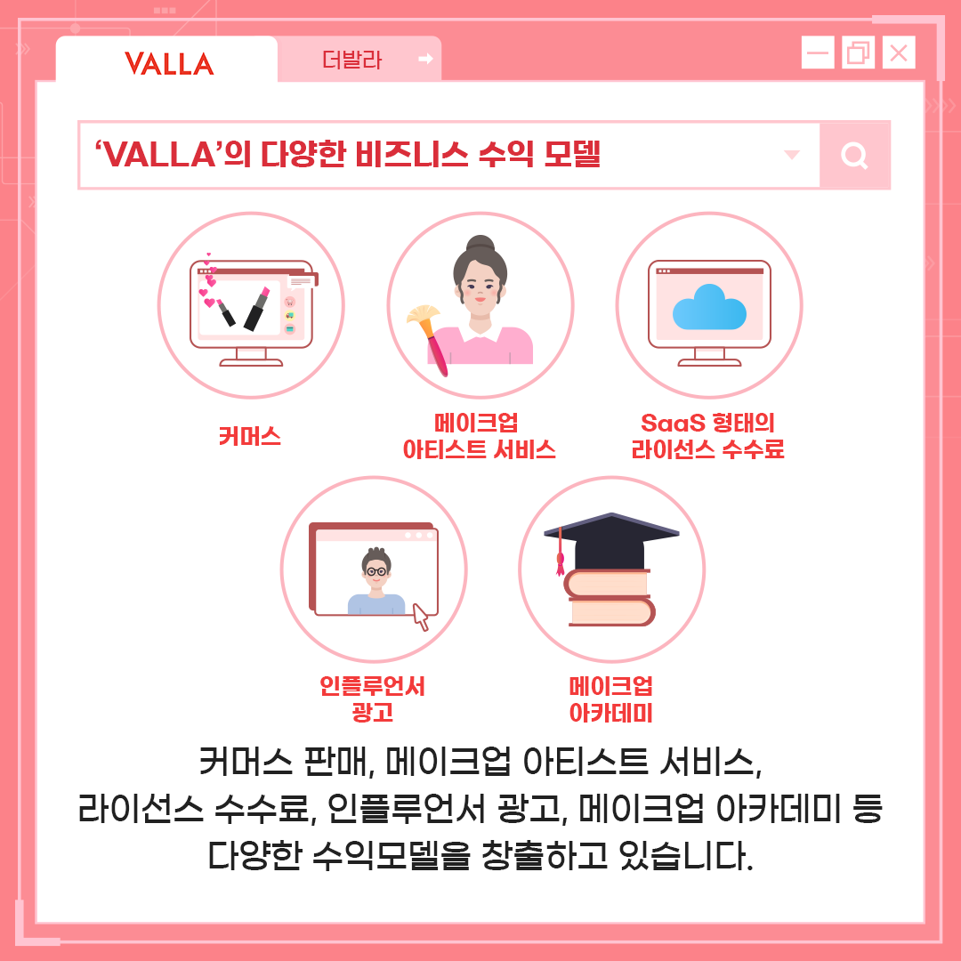 'VALLA'는 커머스 판매, 메이크업 아티스트 서비스, 라이선스 수수료, 인플루언서 광고, 메이크업 아카데미 등