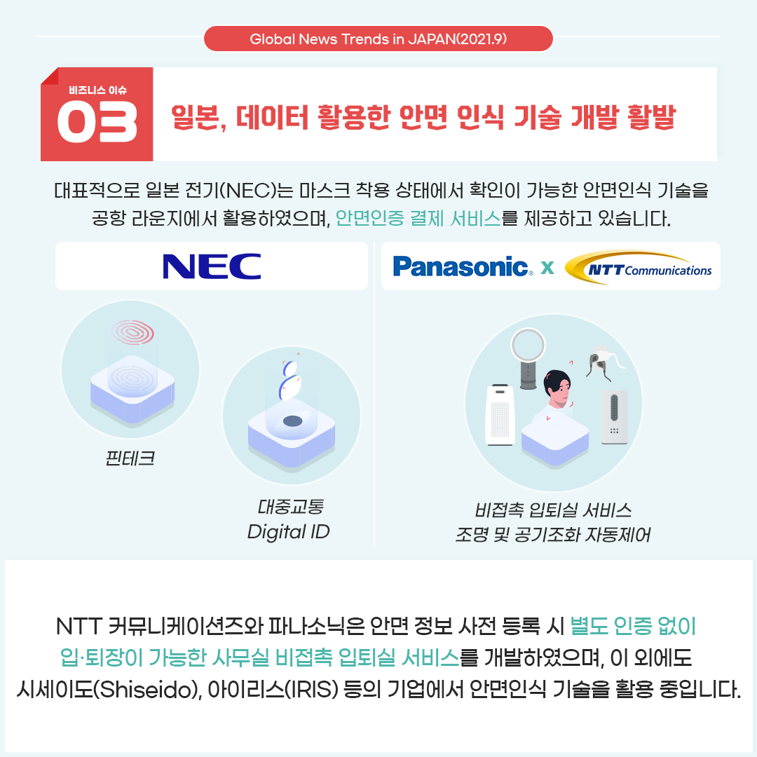 대표적으로 일본 전기(NEC)는 마스크 착용 상태에서 확인이 가능한 안면인식 기술을 공항 라운지에서 활용하였으며,