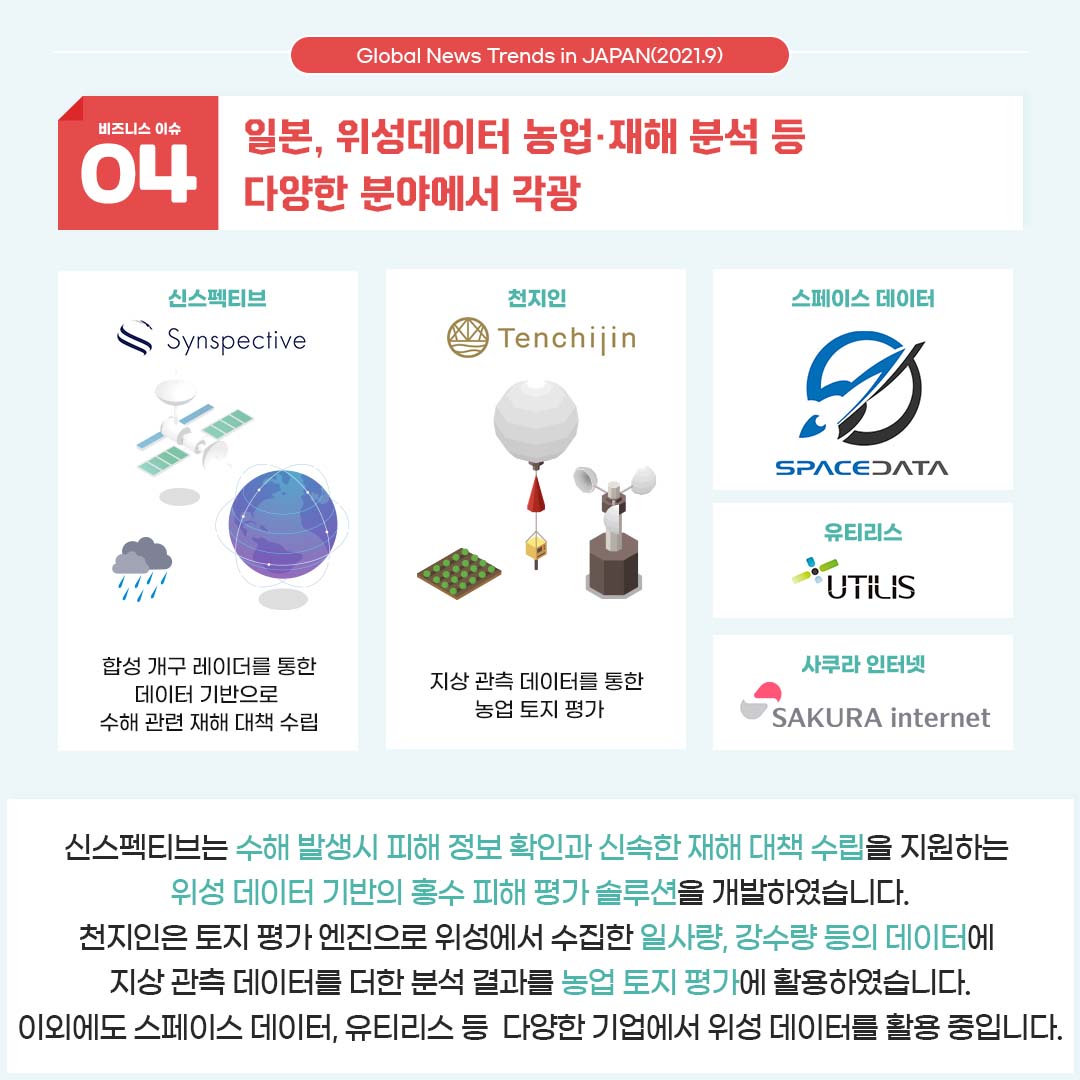 이외에도 스페이스 데이터, 유티리스 등 일본 내 다양한 기업에서 위성 데이터를 활용 중입니다.