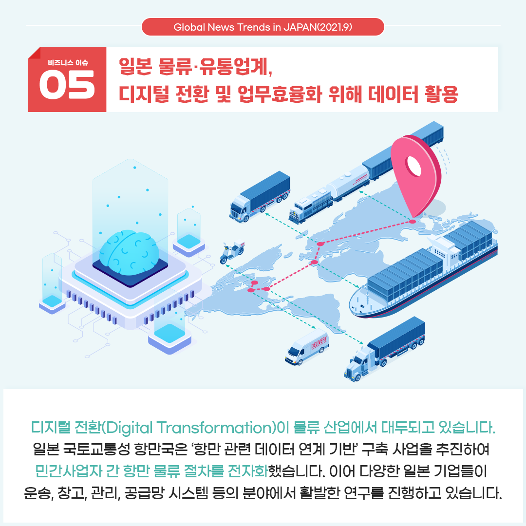 다섯 번째 이슈는 '일본 물류 · 유통업계, 디지털 전환 및 업무효율화 위해 데이터 활용' 입니다.