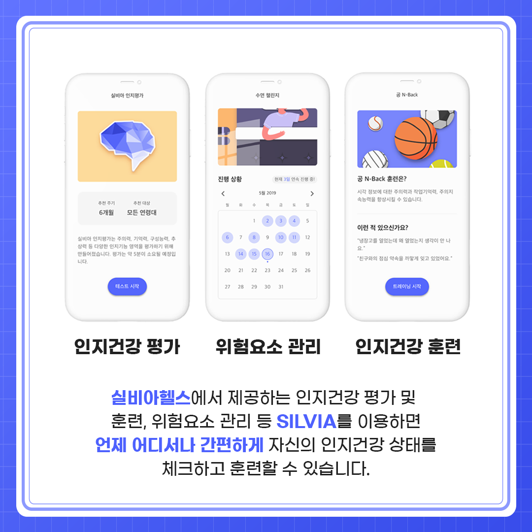 '실비아헬스'에서 제공하는 인지건강 평가 및 훈련, 위험요소 관리 등