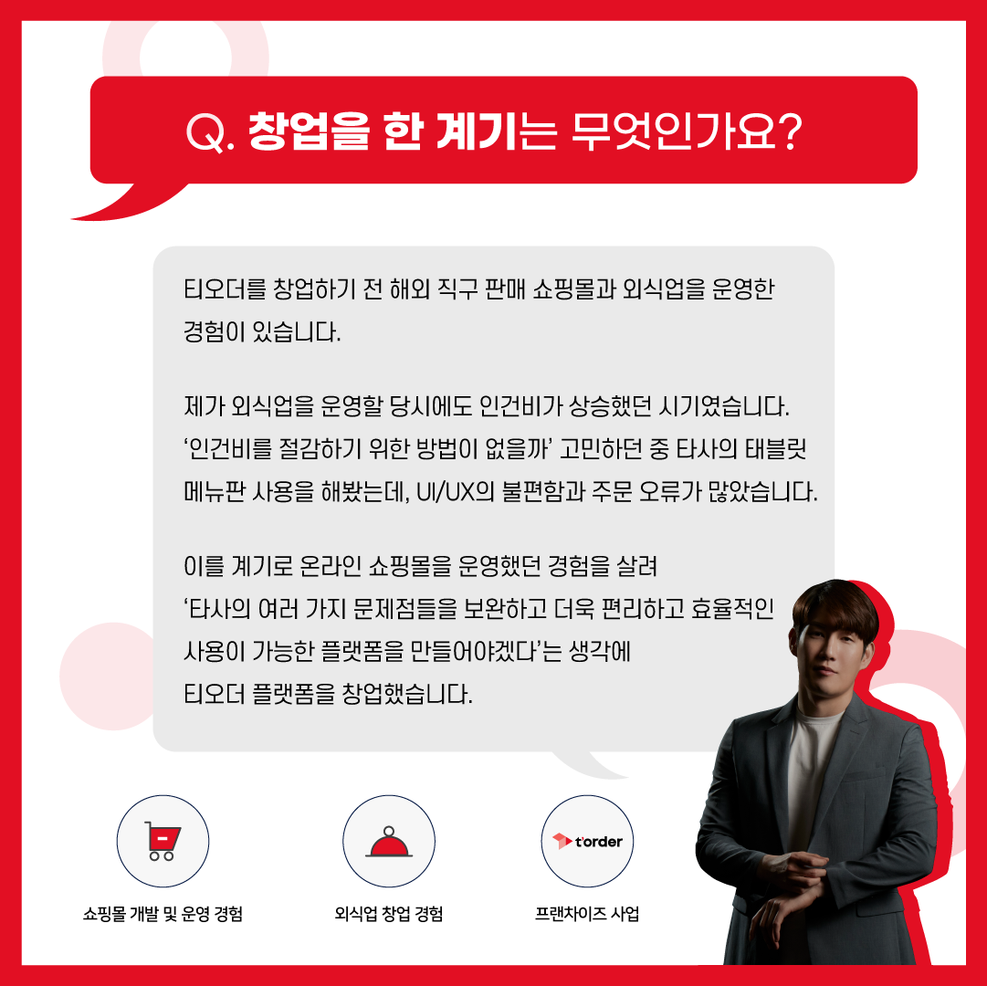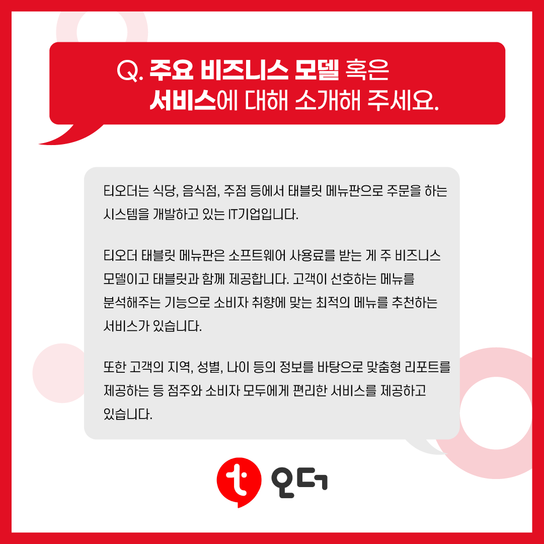 티오더는 식당, 음식점, 주점 등에서 태블릿 메뉴판으로 주문을 하는 시스템을 개발하고 있는 IT기업입니다.