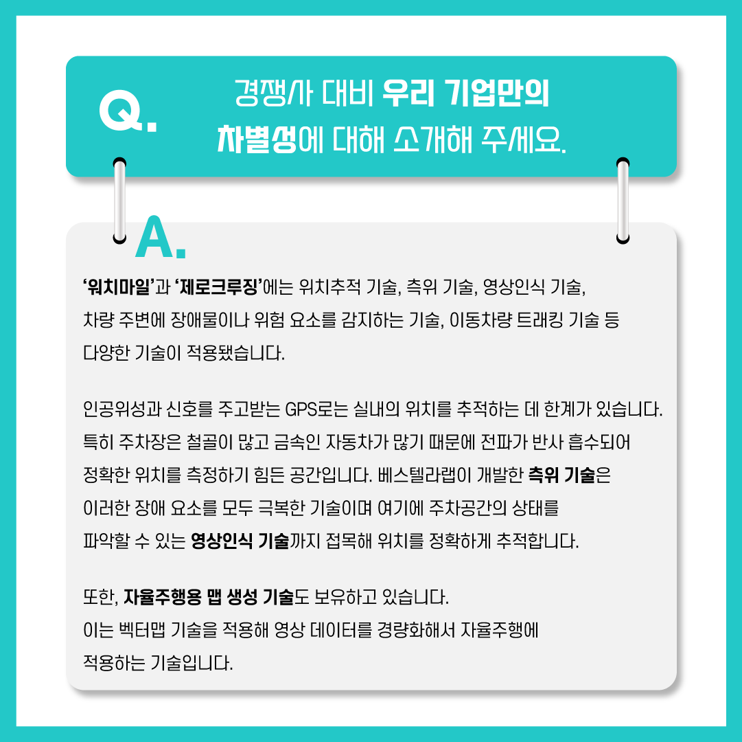 베스텔라랩은 위치추적 기술, 측위 기술, 영상인식 기술 등을 이용해 워치마일(주차 정보 추천 내비게이션 서비스)과 제로크루징(자율주행차 주차 프로토콜)에 적용하고 있습니다.