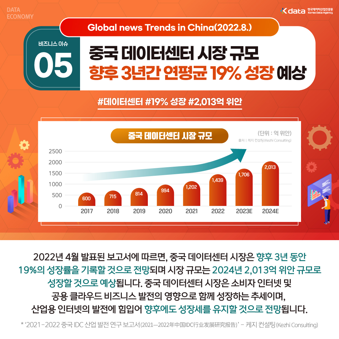 중국 데이터센터 시장은 소비자 인터넷 및 공용 클라우드 비즈니스 발전의 영향으로 함께 성장하는 추세입니다.