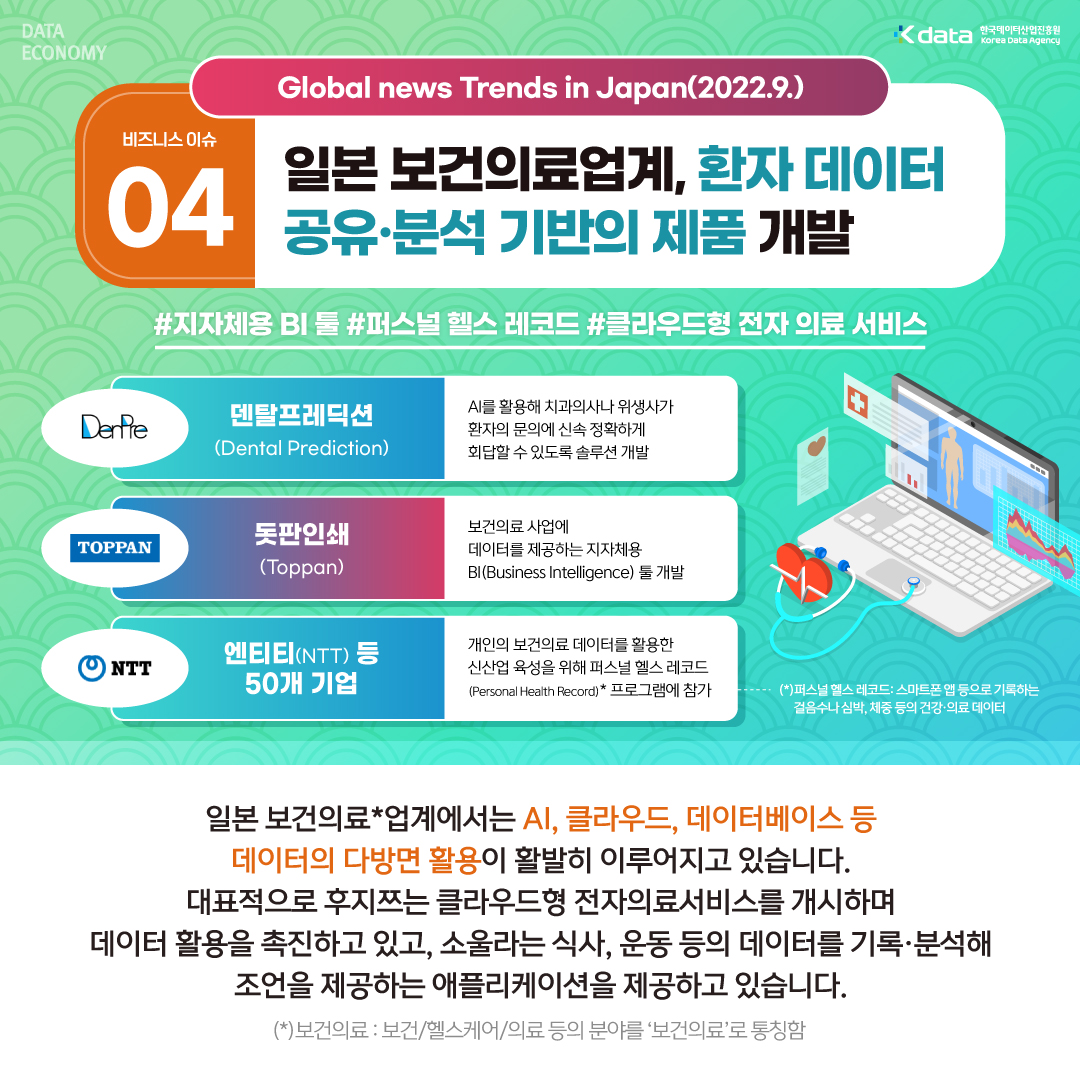 한편 일본 보건의료 업계에서는 AI, 클라우드, 데이터베이스 등 데이터의 다방면 활용이 이루어지고 있습니다.