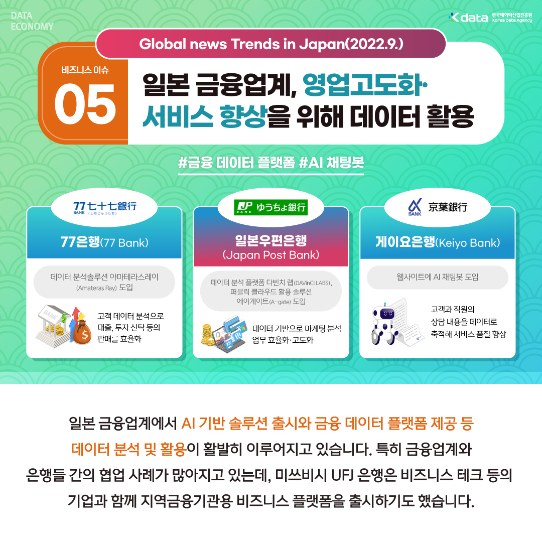 일본 금융업계에서는 AI 기반 솔루션 출시와 금융 데이터 플랫폼 제공 등