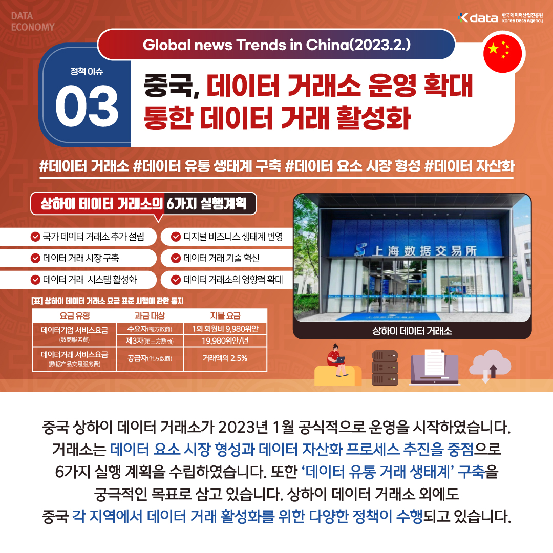 중국 상하이 데이터 거래소가 2023년 1월 공식적으로 운영을 시작하였습니다.