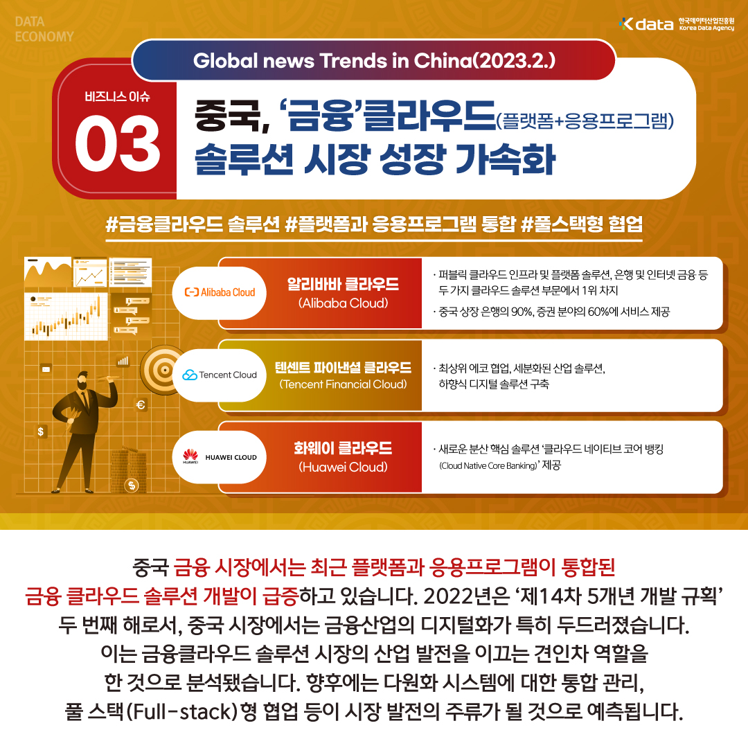 세 번째 이슈는 '중국, '금융'클라우드(플랫폼+응용프로그램) 솔루션 시장 성장 가속화'입니다.