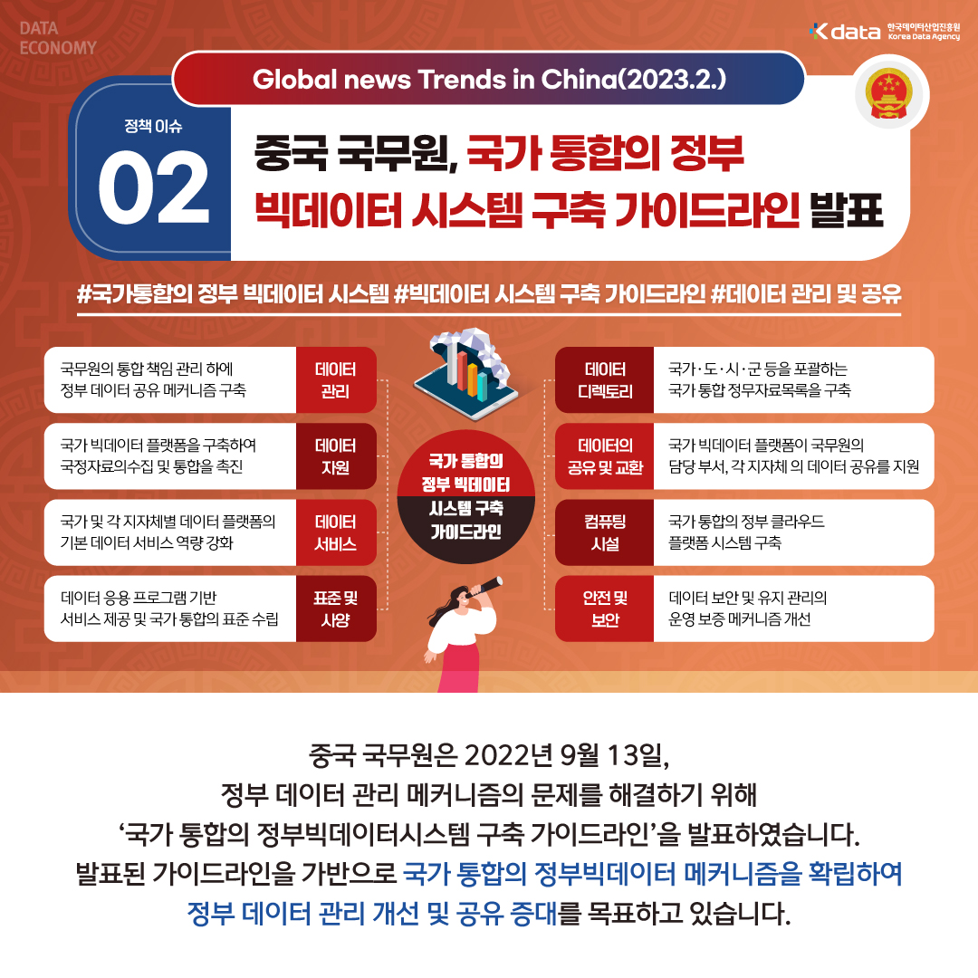 두 번째 이슈는 '중국 국무원, 국가 통합의 정부 빅데이터 시스템 구축 가이드라인 발표'입니다.
