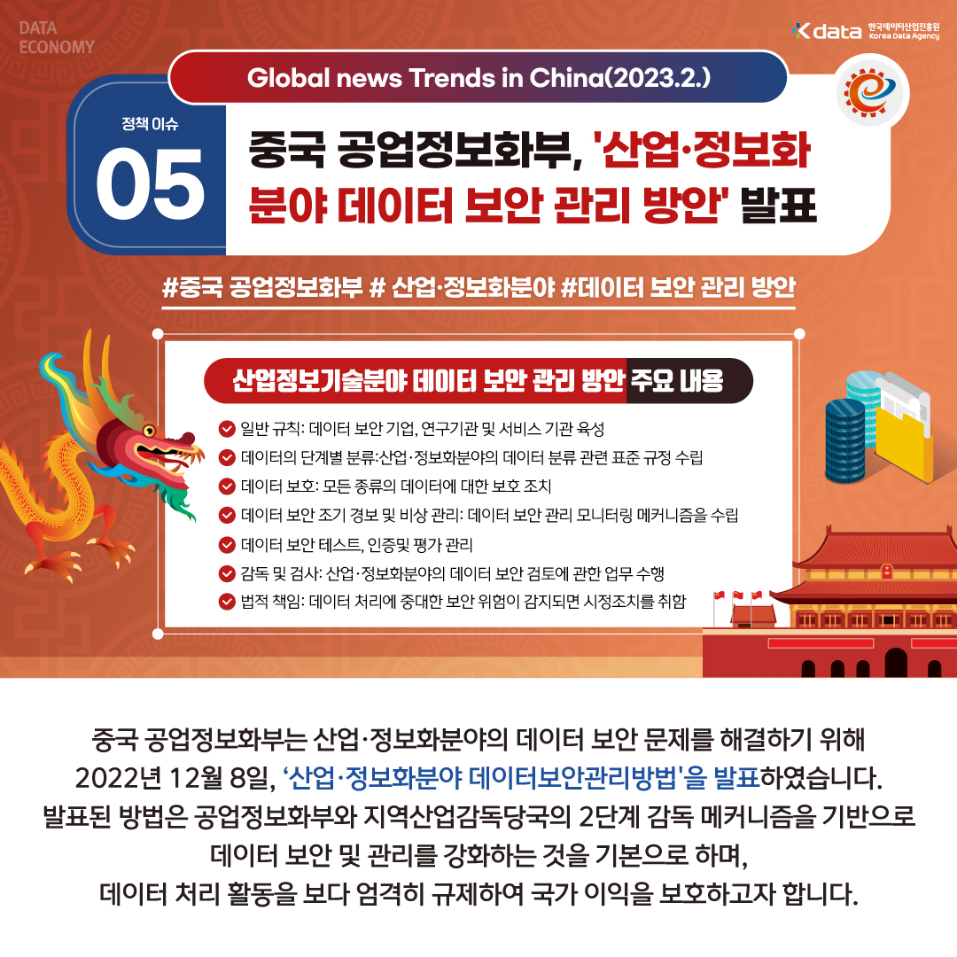 다섯 번째 이슈는 '중국 공업정보화부, '산업·정보화 분야 데이터 보안 관리 방안' 발표'입니다.