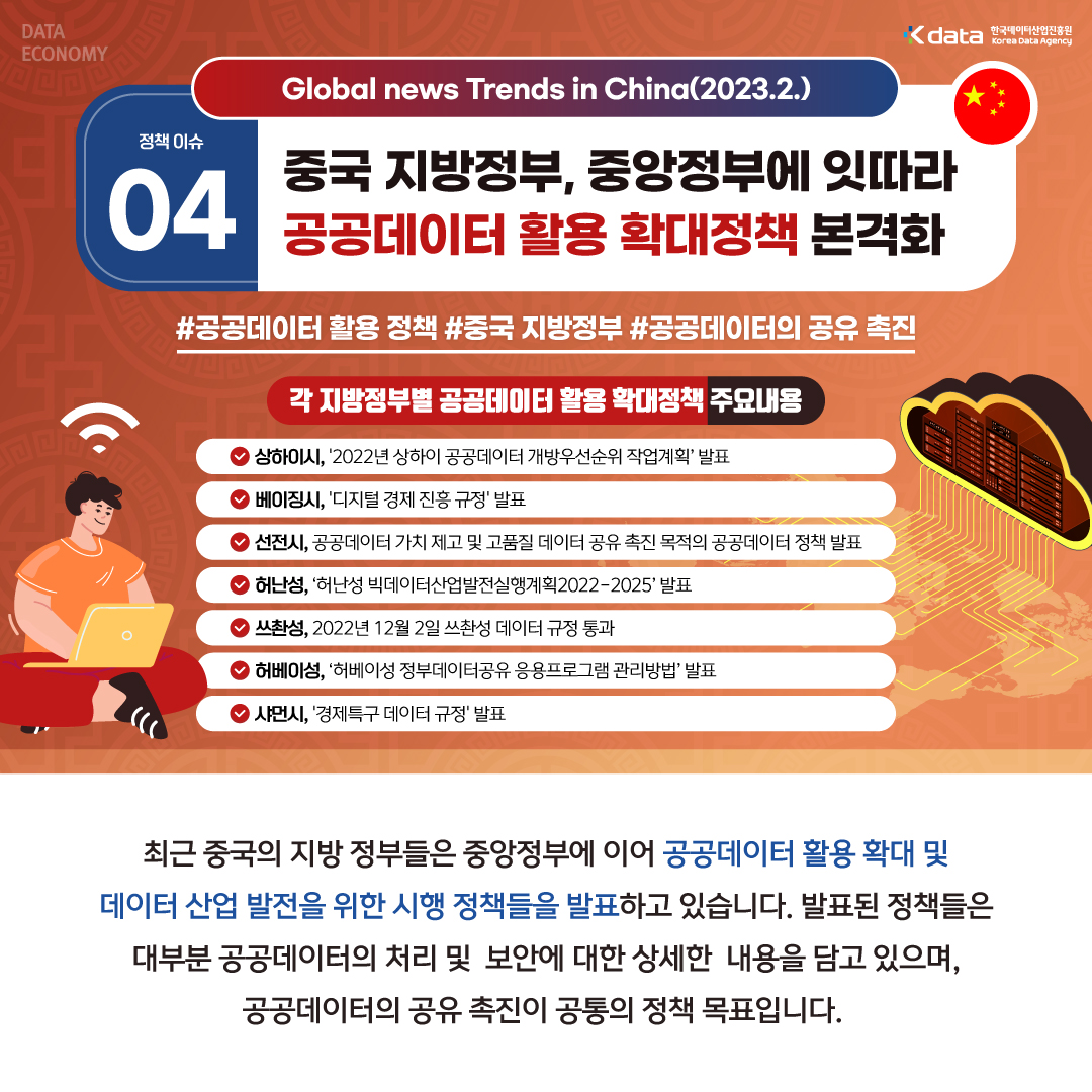 네 번째 이슈는 '중국 지방정부, 중앙정부에 잇다라 공공데이터 활용 확대정책 본격화'입니다.