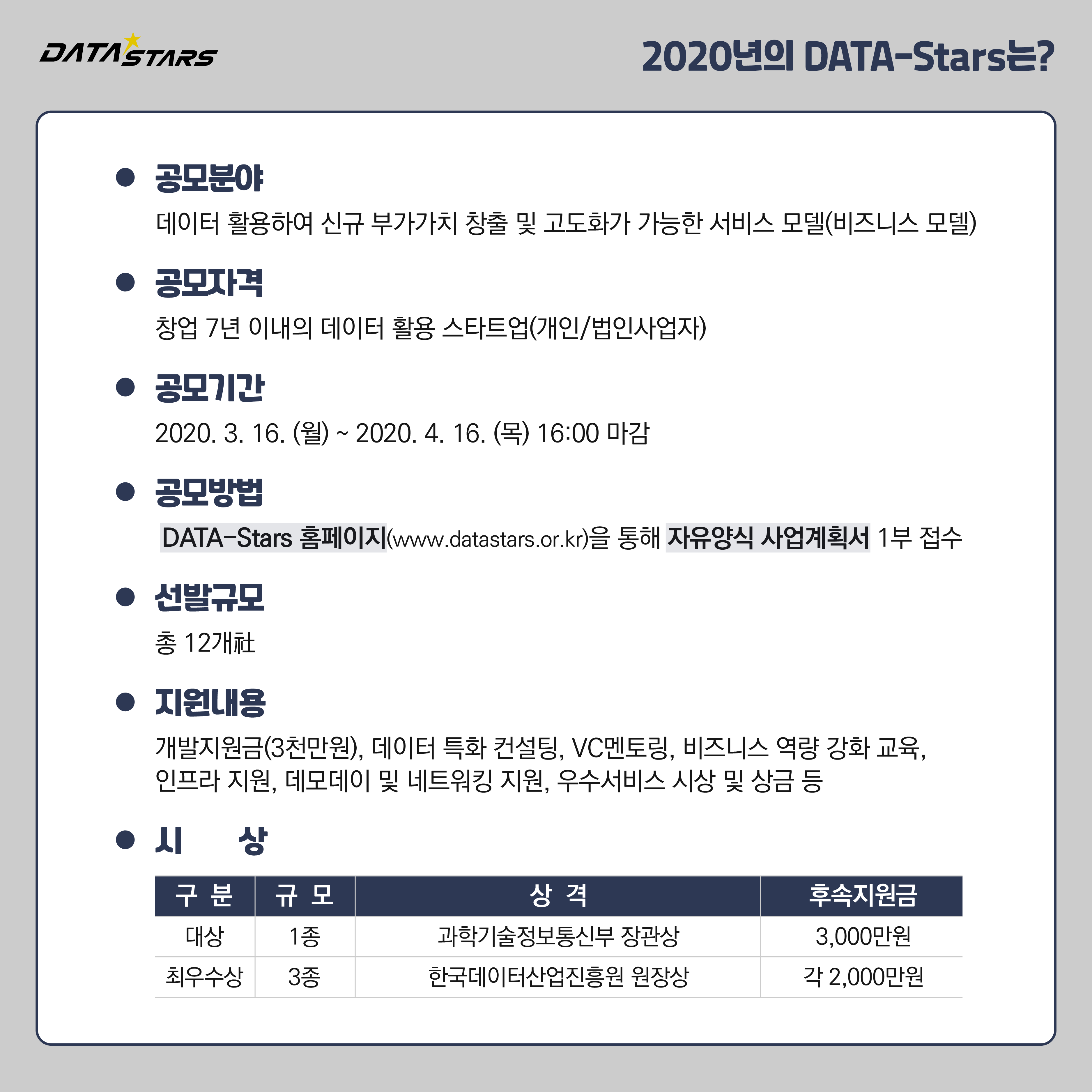 | [2020 DATA-Stars] 데이터 활용 사업화 지원 공모 공고 (3) | 2020.05.03 |